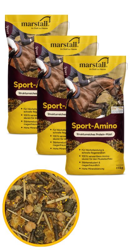 marstall Sport-Amino to strukturalne musli białkowe dla koni sportowych, które dostarcza dobrze przyswajalnych aminokwasów niezbędnych do rozwoju i regeneracji mięśni. Dzięki odpowiednio dobranej recepturze pasza zapewnia również stabilne źródło energii, jednocześnie pozostając przyjazną dla układu pokarmowego konia.